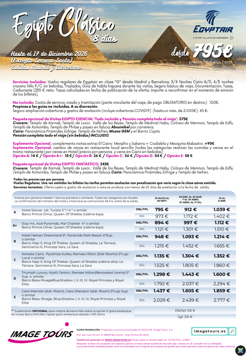 Egipto Clásico 8 días hasta diciembre 2026 desde 795€ en vuelo regular, con Crucero Nilo y Cairo